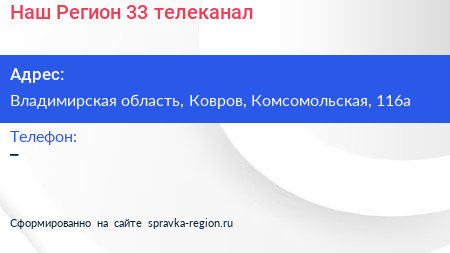Наш Регион 33, телеканал по адресу Владимирская область, Ковров, Комсомольская, 116а в дальнейшем Организация, размещена в следующих категориях: