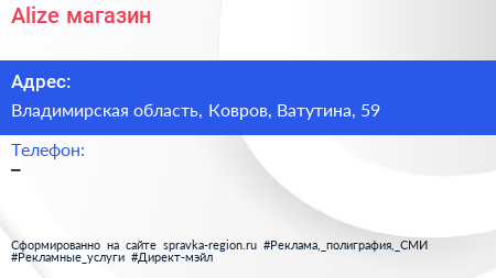 Alize, магазин по адресу Владимирская область, Ковров, Ватутина, 59 в дальнейшем Организация, размещена в следующих категориях: