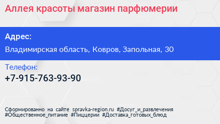 Аллея красоты, магазин парфюмерии по адресу Владимирская область, Ковров, Запольная, 30 в дальнейшем Организация, размещена в следующих категориях: