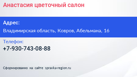 Анастасия, цветочный салон по адресу Владимирская область, Ковров, Абельмана, 16 в дальнейшем Организация, размещена в следующих категориях: