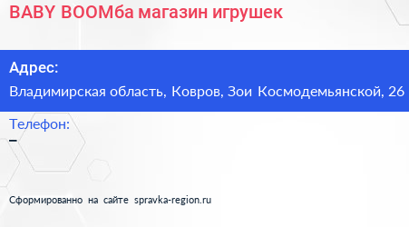 BABY BOOMба, магазин игрушек по адресу Владимирская область, Ковров, Зои Космодемьянской, 26 в дальнейшем Организация, размещена в следующих категориях: