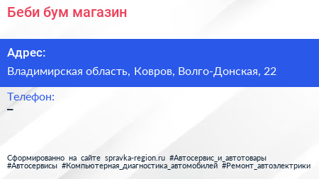 Беби-бум, магазин по адресу Владимирская область, Ковров, Волго-Донская, 22 в дальнейшем Организация, размещена в следующих категориях: