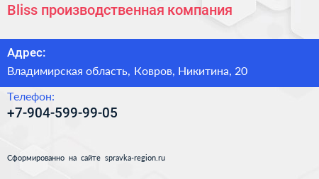 Bliss, производственная компания по адресу Владимирская область, Ковров, Никитина, 20 в дальнейшем Организация, размещена в следующих категориях: