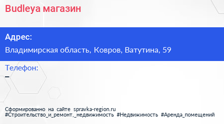 Budleya, магазин по адресу Владимирская область, Ковров, Ватутина, 59 в дальнейшем Организация, размещена в следующих категориях: