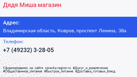 Дядя Миша, магазин по адресу Владимирская область, Ковров, проспект Ленина, 38а в дальнейшем Организация, размещена в следующих категориях: