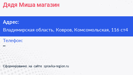 Дядя Миша, магазин по адресу Владимирская область, Ковров, Комсомольская, 116 ст4 в дальнейшем Организация, размещена в следующих категориях: