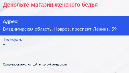 Декольте, магазин женского белья по адресу Владимирская область, Ковров, проспект Ленина, 59 в дальнейшем Организация, размещена в следующих категориях: