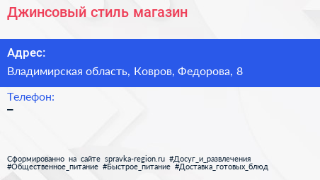 Джинсовый стиль, магазин по адресу Владимирская область, Ковров, Федорова, 8 в дальнейшем Организация, размещена в следующих категориях: