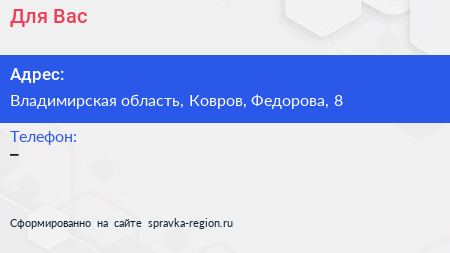 Для Вас по адресу Владимирская область, Ковров, Федорова, 8 в дальнейшем Организация, размещена в следующих категориях: