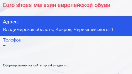 Euro shoes, магазин европейской обуви по адресу Владимирская область, Ковров, Чернышевского, 1 в дальнейшем Организация, размещена в следующих категориях: