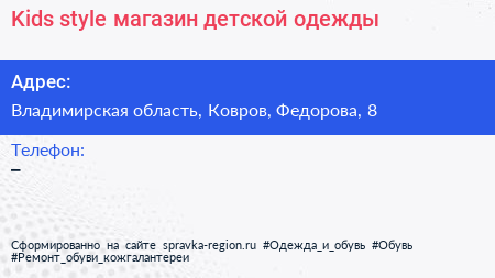 Kids style, магазин детской одежды по адресу Владимирская область, Ковров, Федорова, 8 в дальнейшем Организация, размещена в следующих категориях: