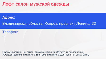 Лофт, салон мужской одежды по адресу Владимирская область, Ковров, проспект Ленина, 32 в дальнейшем Организация, размещена в следующих категориях: