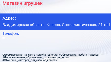 Магазин игрушек по адресу Владимирская область, Ковров, Социалистическая, 21 ст1 в дальнейшем Организация, размещена в следующих категориях: