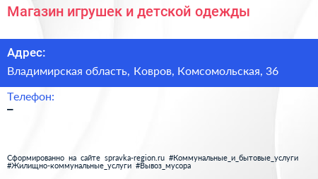 Магазин игрушек и детской одежды по адресу Владимирская область, Ковров, Комсомольская, 36 в дальнейшем Организация, размещена в следующих категориях: