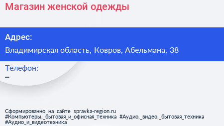 Магазин женской одежды по адресу Владимирская область, Ковров, Абельмана, 38 в дальнейшем Организация, размещена в следующих категориях:
