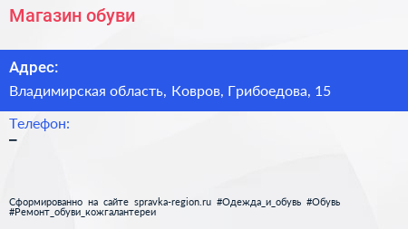 Магазин обуви по адресу Владимирская область, Ковров, Грибоедова, 15 в дальнейшем Организация, размещена в следующих категориях: