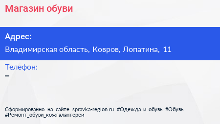 Магазин обуви по адресу Владимирская область, Ковров, Лопатина, 11 в дальнейшем Организация, размещена в следующих категориях: