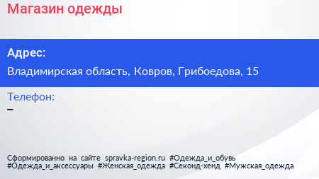 Магазин одежды по адресу Владимирская область, Ковров, Грибоедова, 15 в дальнейшем Организация, размещена в следующих категориях: