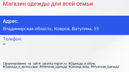 Магазин одежды для всей семьи по адресу Владимирская область, Ковров, Ватутина, 55 в дальнейшем Организация, размещена в следующих категориях: