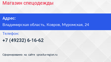 Магазин спецодежды по адресу Владимирская область, Ковров, Муромская, 24 в дальнейшем Организация, размещена в следующих категориях: