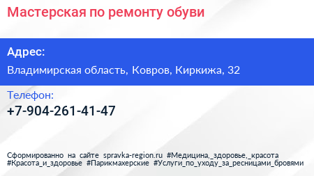 Мастерская по ремонту обуви по адресу Владимирская область, Ковров, Киркижа, 32 в дальнейшем Организация, размещена в следующих категориях: