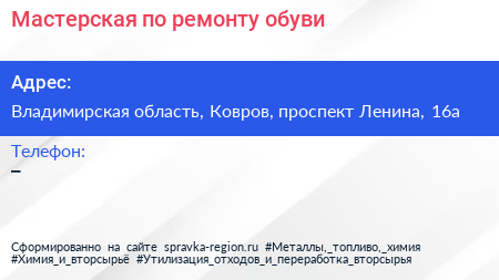 Мастерская по ремонту обуви по адресу Владимирская область, Ковров, проспект Ленина, 16а в дальнейшем Организация, размещена в следующих категориях: