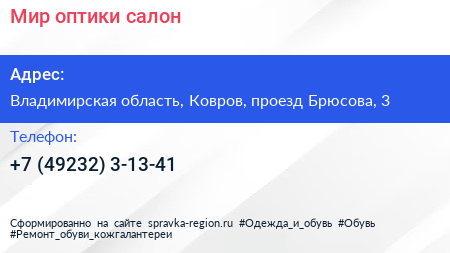 Мир оптики, салон по адресу Владимирская область, Ковров, проезд Брюсова, 3 в дальнейшем Организация, размещена в следующих категориях:
