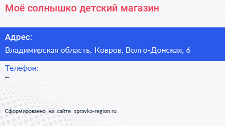 Моё солнышко, детский магазин по адресу Владимирская область, Ковров, Волго-Донская, 6 в дальнейшем Организация, размещена в следующих категориях: