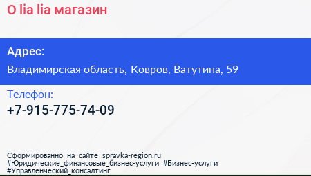 O-lia-lia, магазин по адресу Владимирская область, Ковров, Ватутина, 59 в дальнейшем Организация, размещена в следующих категориях: