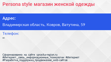 Persona style, магазин женской одежды по адресу Владимирская область, Ковров, Ватутина, 59 в дальнейшем Организация, размещена в следующих категориях: