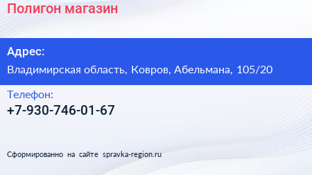 Полигон, магазин по адресу Владимирская область, Ковров, Абельмана, 105/20 в дальнейшем Организация, размещена в следующих категориях: