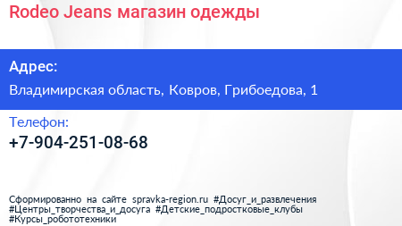Rodeo Jeans, магазин одежды по адресу Владимирская область, Ковров, Грибоедова, 1 в дальнейшем Организация, размещена в следующих категориях:
