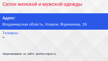 Салон женской и мужской одежды по адресу Владимирская область, Ковров, Фурманова, 18 в дальнейшем Организация, размещена в следующих категориях:
