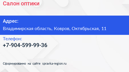 Салон оптики по адресу Владимирская область, Ковров, Октябрьская, 11 в дальнейшем Организация, размещена в следующих категориях: