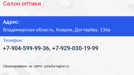 Салон оптики по адресу Владимирская область, Ковров, Дегтярёва, 136а в дальнейшем Организация, размещена в следующих категориях: