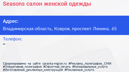 Seasons, салон женской одежды по адресу Владимирская область, Ковров, проспект Ленина, 65 в дальнейшем Организация, размещена в следующих категориях: