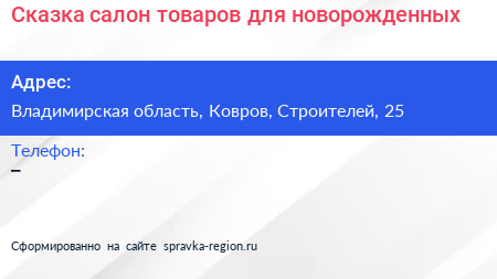 Сказка, салон товаров для новорожденных по адресу Владимирская область, Ковров, Строителей, 25 в дальнейшем Организация, размещена в следующих категориях:
