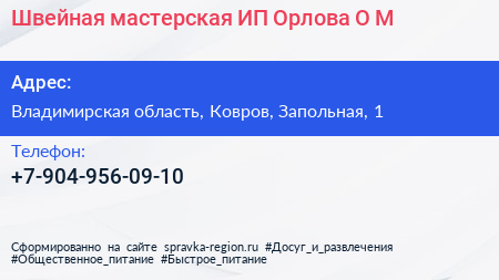 Швейная мастерская, ИП Орлова О.М. по адресу Владимирская область, Ковров, Запольная, 1 в дальнейшем Организация, размещена в следующих категориях:
