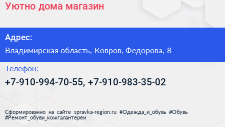 Уютно дома, магазин по адресу Владимирская область, Ковров, Федорова, 8 в дальнейшем Организация, размещена в следующих категориях:
