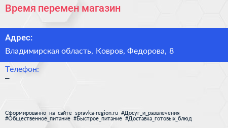 Время перемен, магазин по адресу Владимирская область, Ковров, Федорова, 8 в дальнейшем Организация, размещена в следующих категориях: