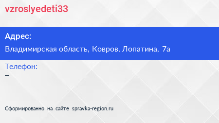 vzroslyedeti33 по адресу Владимирская область, Ковров, Лопатина, 7а в дальнейшем Организация, размещена в следующих категориях: