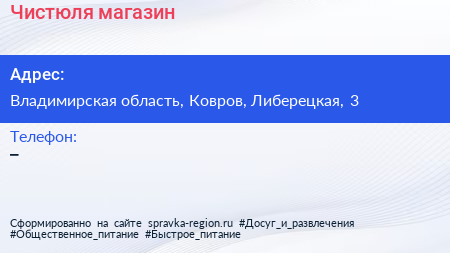 Чистюля, магазин по адресу Владимирская область, Ковров, Либерецкая, 3 в дальнейшем Организация, размещена в следующих категориях: