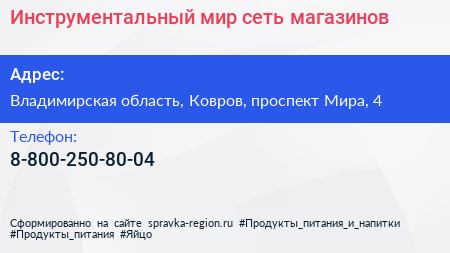 Инструментальный мир, сеть магазинов по адресу Владимирская область, Ковров, проспект Мира, 4 в дальнейшем Организация, размещена в следующих категориях: