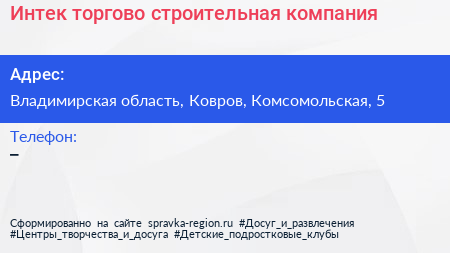 Интек, торгово-строительная компания по адресу Владимирская область, Ковров, Комсомольская, 5 в дальнейшем Организация, размещена в следующих категориях: