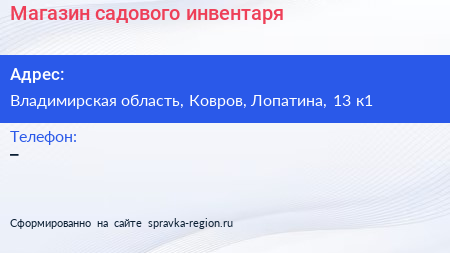 Магазин садового инвентаря по адресу Владимирская область, Ковров, Лопатина, 13 к1 в дальнейшем Организация, размещена в следующих категориях: