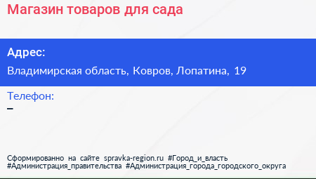 Магазин товаров для сада по адресу Владимирская область, Ковров, Лопатина, 19 в дальнейшем Организация, размещена в следующих категориях: