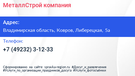 МеталлСтрой, компания по адресу Владимирская область, Ковров, Либерецкая, 5а в дальнейшем Организация, размещена в следующих категориях: