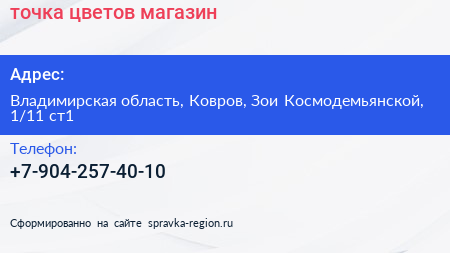 #точка цветов, магазин по адресу Владимирская область, Ковров, Зои Космодемьянской, 1/11 ст1 в дальнейшем Организация, размещена в следующих категориях: