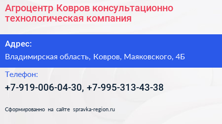 Агроцентр-Ковров, консультационно-технологическая компания по адресу Владимирская область, Ковров, Маяковского, 4Б в дальнейшем Организация, размещена в следующих категориях: