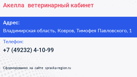 Акелла+, ветеринарный кабинет по адресу Владимирская область, Ковров, Тимофея Павловского, 1 в дальнейшем Организация, размещена в следующих категориях: